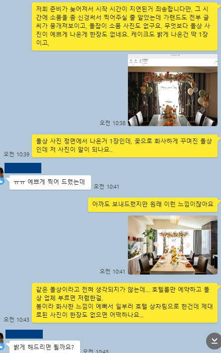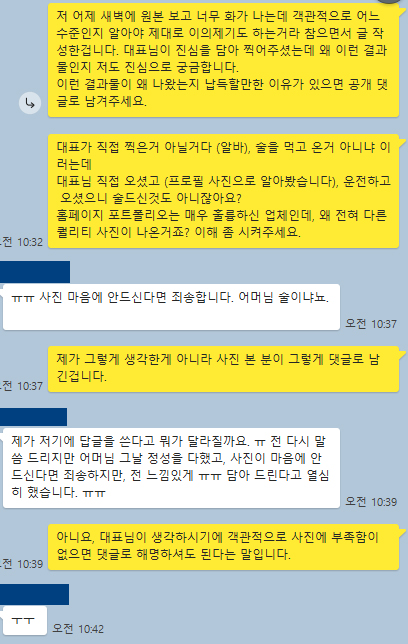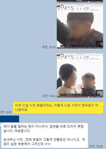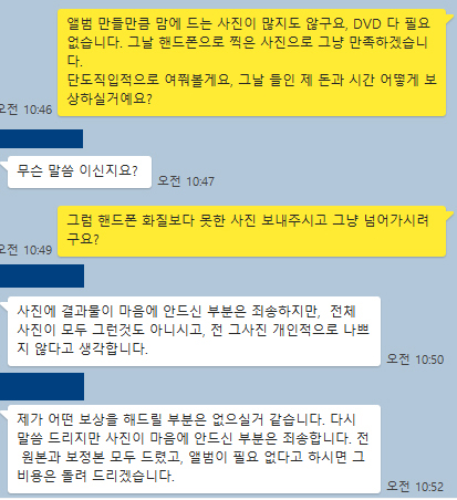 업체에 항의하자 사진 작가는 “ㅠㅠ예쁘게 찍어드렸는데. 밝게 해드리면 될까요?”라고 되물었다.