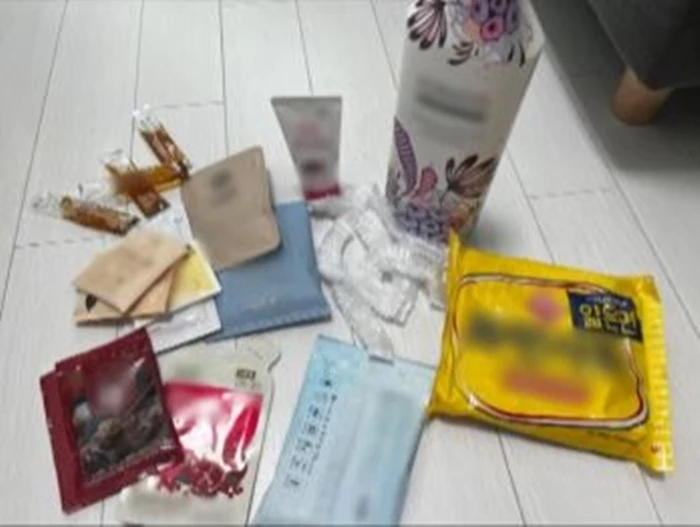 공개된 사진에는 일회용 간장 소스, 라면 사리 한 봉지, 쓰다 남은 클렌징폼 등이 있었다.