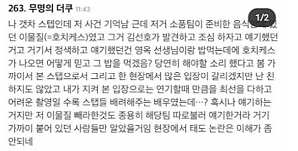 해당 스태프는 당시 제작진이 준비한 반찬에서 ‘이물질’이 나오자 김선호 태도가 돌변했다고 주장했는데 “(김선호 응원 게시물을 올린) 글쓴이는 김선호의 측근일 것”이라며 김선호를 응원한 스태프에 대해 의심을 했다.