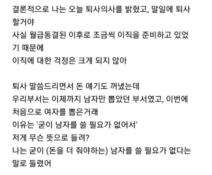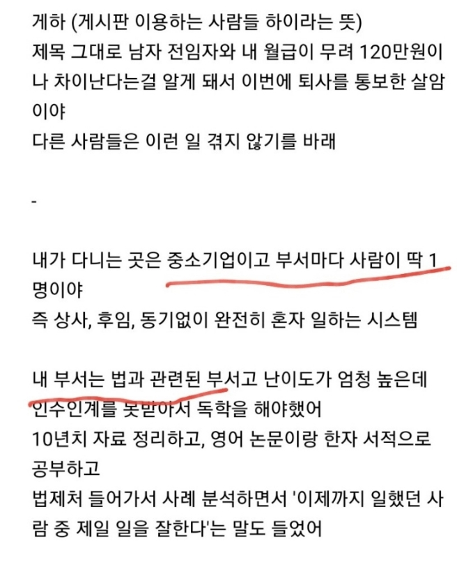 과거 한 온라인 커뮤니티에는 “남자 직원이랑 월급 120만 원 차이 나서 퇴사한 후기”라는 글이 올라왔다.
