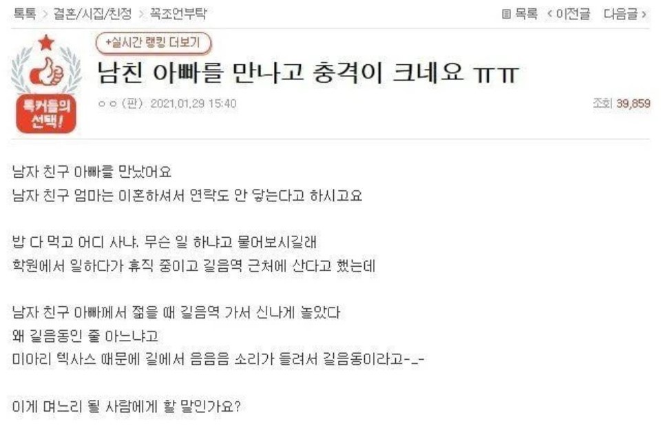 지난달 29일 한 온라인 커뮤니티에는 ‘남친 아빠를 만나고 충격이 크네요’라는 제목의 글이 올라왔다.