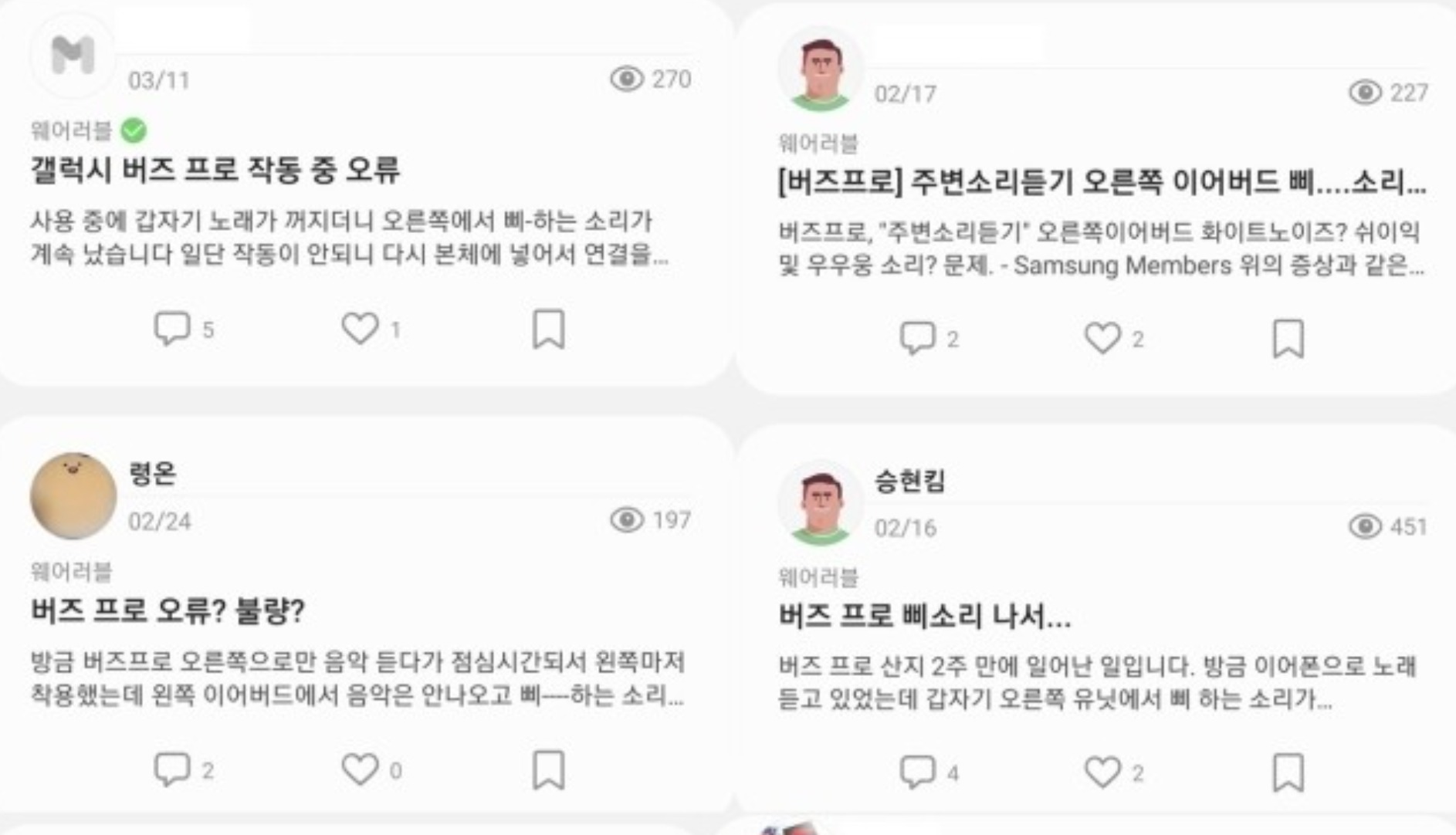 하지만 갤럭시버즈 프로에 대해 제기되고 있는 문제는 ‘외이도염’뿐만이 아니라 한 쪽 유닛에서 주변소리듣기 모드 사용 중 소음이 발생하는 불량 문제도 제기됐다.
