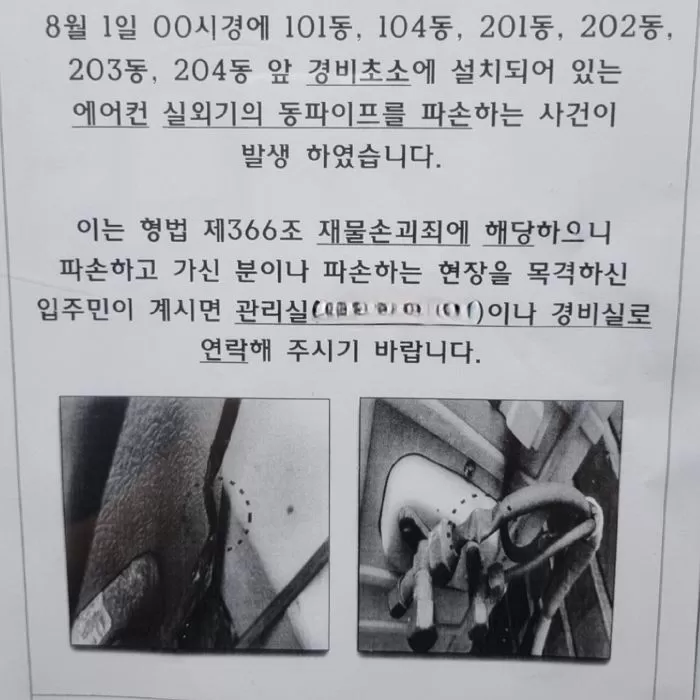 공지문에 따르면 지난 1일 새벽 12시경 6개 동의 경비초소에 설치되어 있는 에어컨 실외기의 동파이프가 누군가에 의해 파손됐다.