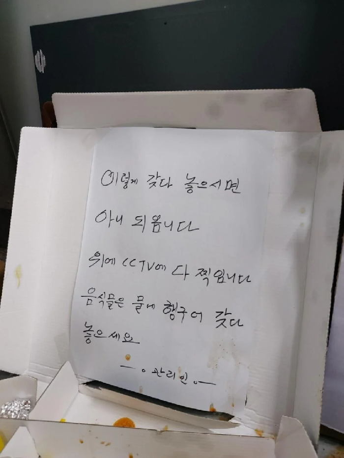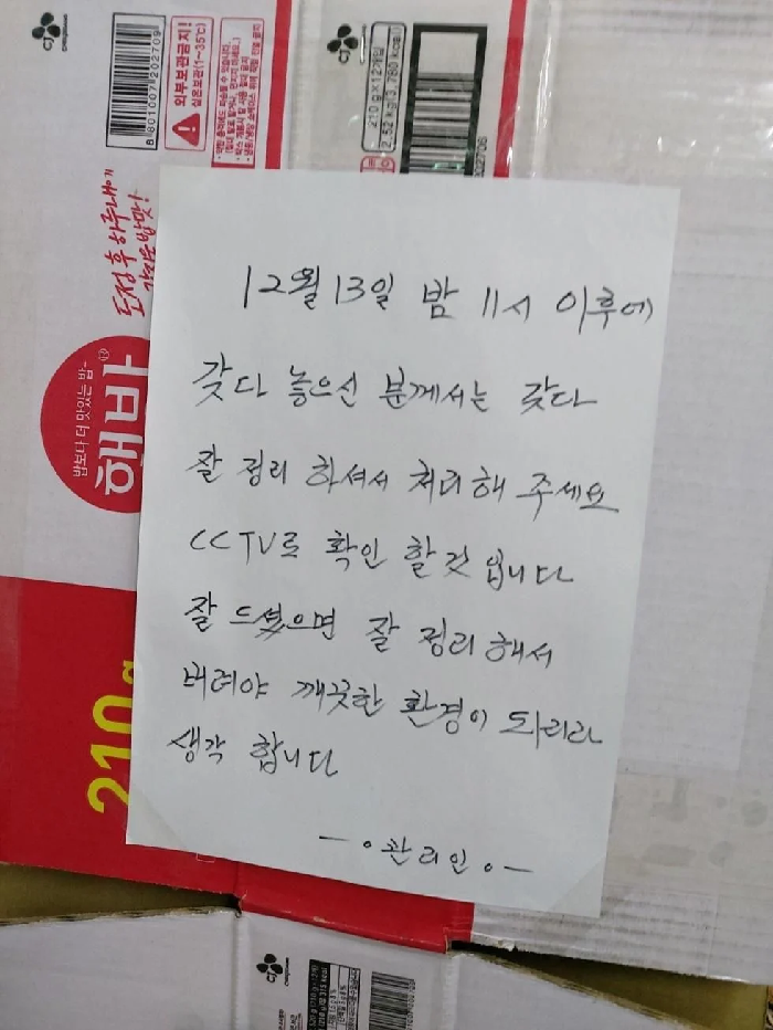 CCTV를 확인할 것”이라며 “잘 정리해서 버려야 깨끗한 환경이 된다”고 안내문을 붙였다.