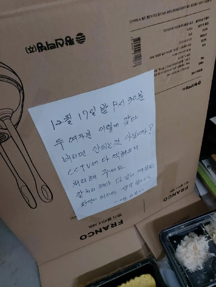 그러나 입주민의 행동이 달라지지 않자 결국 관리인은 “두 여자분 이렇게 갖다 버리면 안되는 것 아닙니까! CCTV에 다 찍혔으니 처리해달라. 잘 처리해야 다같이 깨끗한 환경이 되리라 생각한다”고 분노했다.