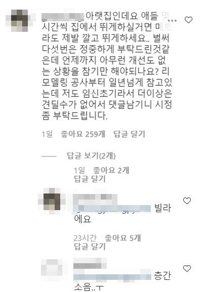 또 “리모델링 공사부터 1년 넘게 참고 있는데 나도 임신 초기라 더 이상은 견딜 수가 없어서 댓글 남긴다. 시정 좀 부탁드린다”고 토로했다.