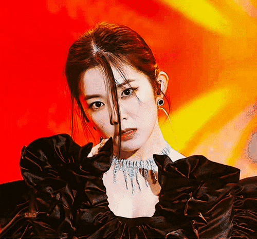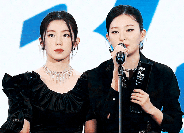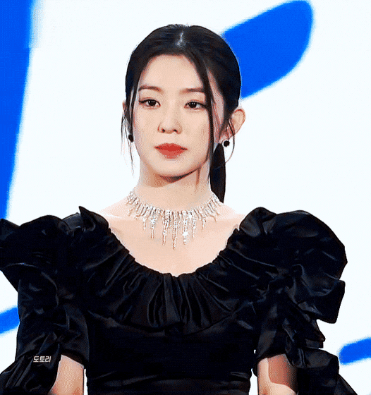 검정색 드레스를 갖춰 입은 아이린은 연신 앞의 ‘더듬이’가 신경쓰인 듯이 고개를 양쪽으로 흔들어 ‘더듬이’를 치우기 위해 노력하는 모습이다.