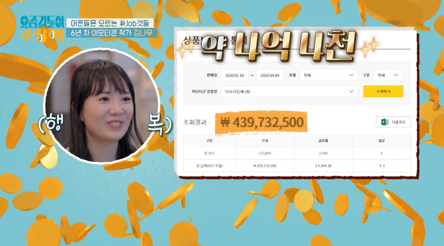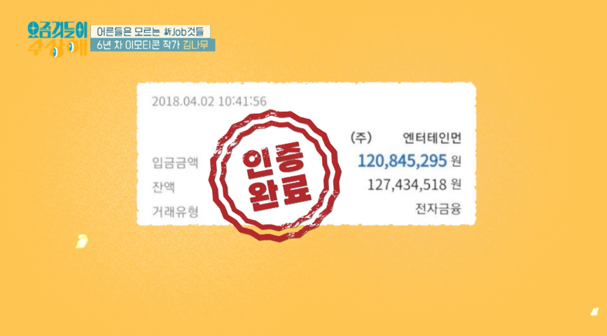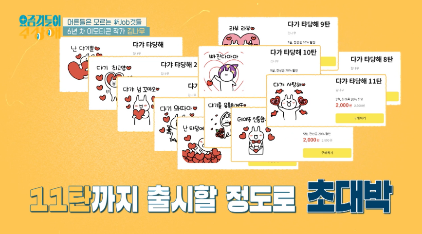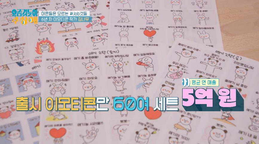 김나무는 “지금까지 이모티콘을 5,000개 정도 그린 것 같다”며 “6년 전 처음 출시한 이모티콘이 첫 달 수입 1억 2,000만 원 정도 나왔다”고 밝혔다.