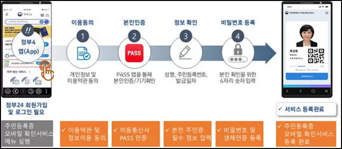 개정된 주민등록법에 따라 ‘주민등록증 모바일 확인서비스’를 이용해 신분확인한 경우 실물 주민등록증을 확인한 것과 동일한 효력을 갖게 되는데, 해당 서비스를 이용하기 위해서는 우선 본인 명의의 스마트폰으로 서비스 등록을 해야 한다.