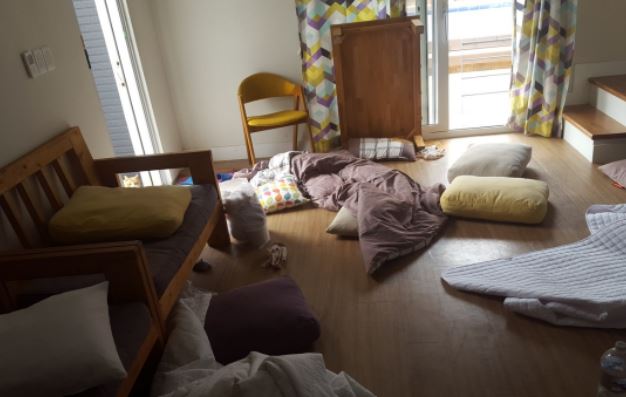 그가 공개한 사진에 따르면 2개의 침대가 놓인 방의 베개, 이불, 바닥 등에는 인분으로 추정되는 배설물이 곳곳에 묻어 있었다.