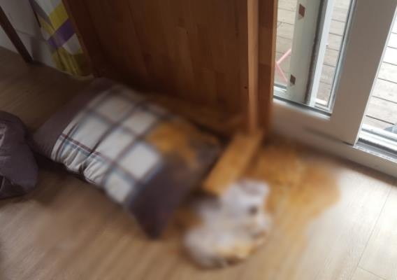 사진 속에서 옆으로 세워져 있는 식탁 아래에는 토사물이 그대로 있었다.