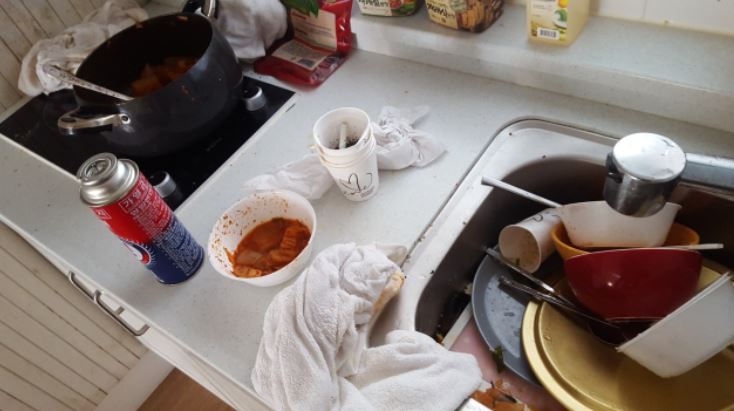 잔뜩 쌓인 설거지거리는 물론, 담배꽁초가 담긴 종이컵 또한 남겨져 있었다.