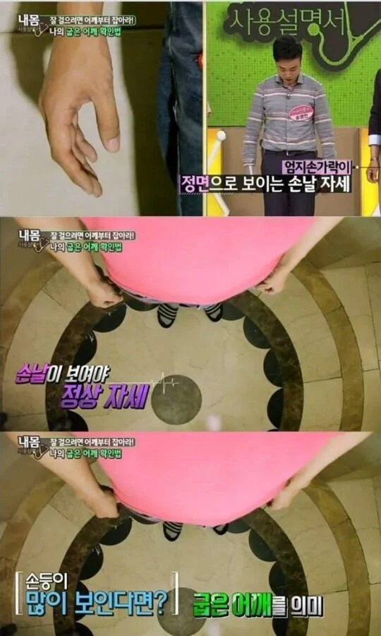 정면을 보고 섰을 때 엄지손가락보다 손등이 많이 보인다면 굽은 어깨에 해당한다.