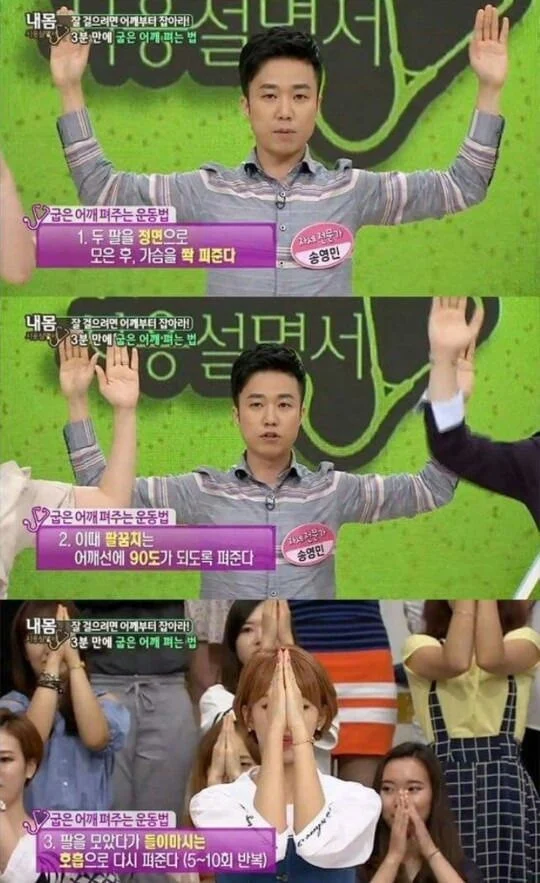 우선 두 팔을 정면으로 모은 후 가슴을 쫙 펴준다.