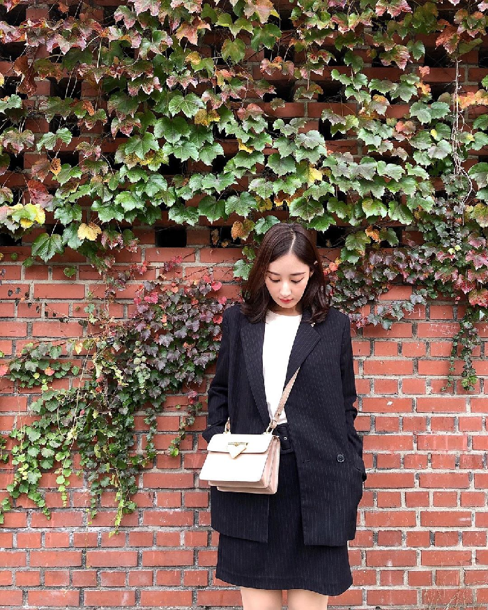 해당 사진 속 박유라는 베이지 색상의 프라다 숄더백을 메고 카메라를 응시하고 있다.