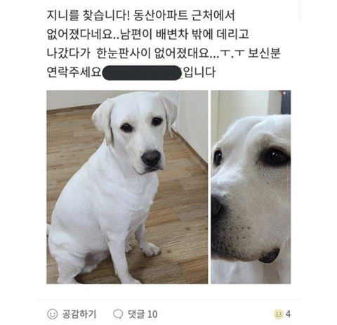A씨는 당근마켓에 “동산아파트 근처에서 없어졌다더라. 남편이 배변차 밖에 데리고 나갔다가 한눈 판 사이에 없어졌대요. 보신분 연락 주세요”라고 적었다.