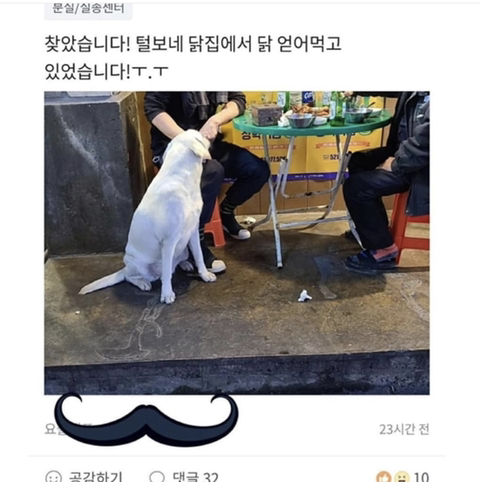 A씨는 “찾았다. 털보네 닭집에서 닭 얻어먹고 있더라”고 결말을 전했다.