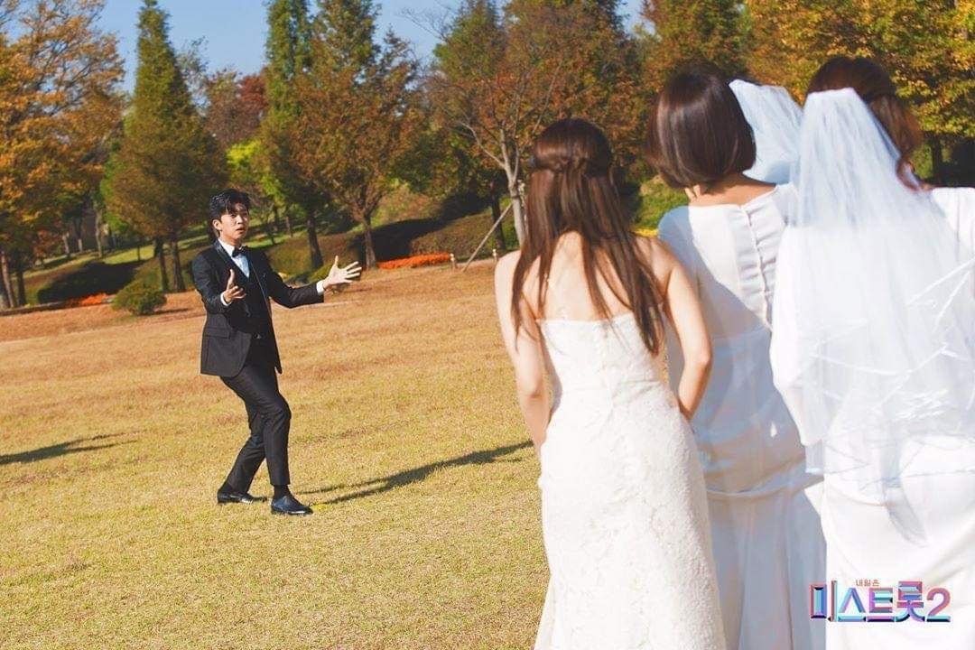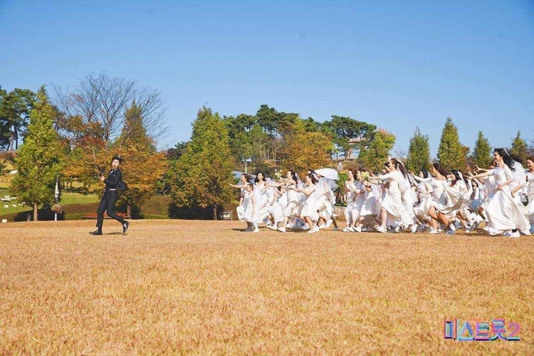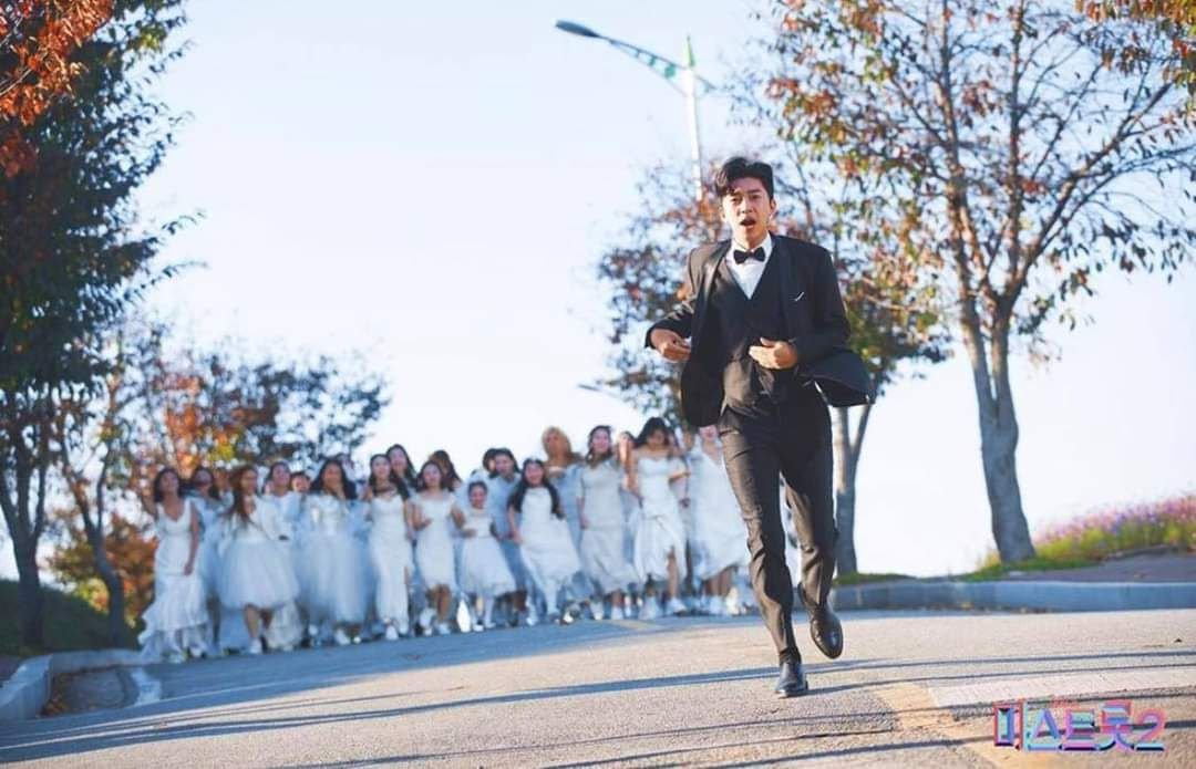 공개된 사진 속에는 도망치는 임영웅과 웨딩드레스 차림의 신부 100명이 뒤를 쫓는 모습을 확인할 수 있다.