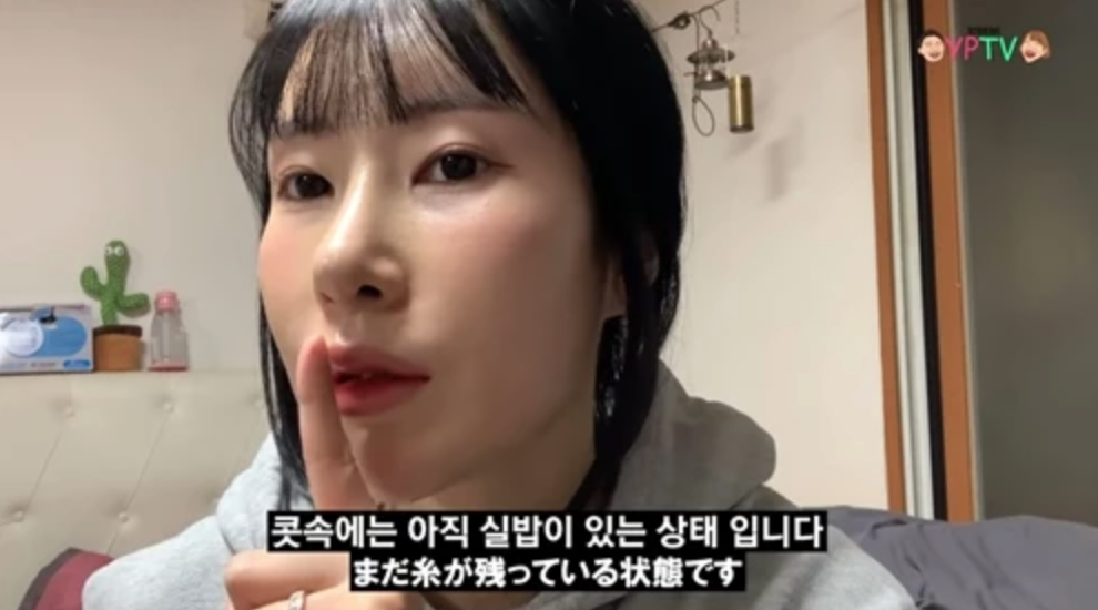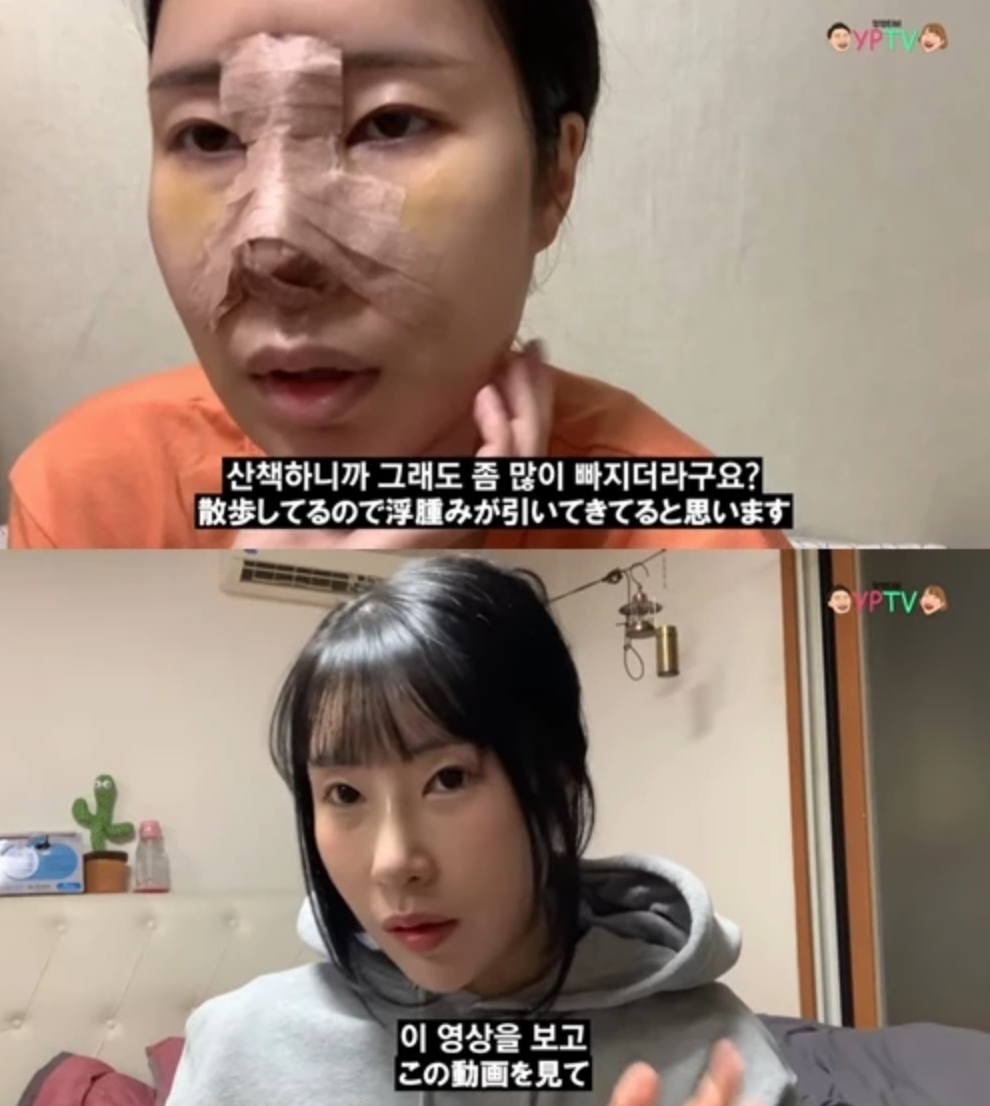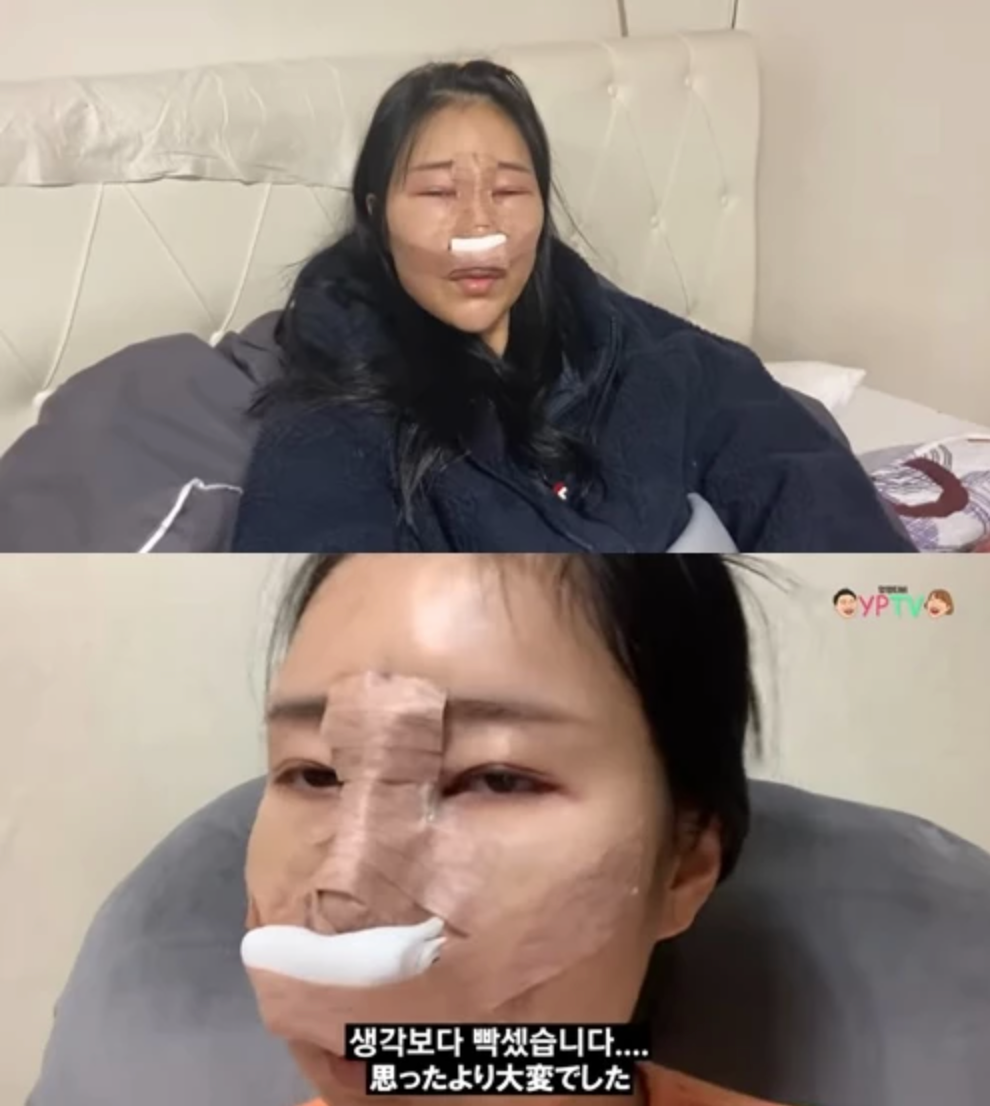 수술한 지 3일째에는 “부기가 밑으로 내려왔고 노란 멍이 올라왔다. 눈과 머리가 아프다. 앉아서 자려니 허리도 아프고, 잠도 못 잤다. 계속 잠을 제대로 못 자서 두통이 심하다”라고 전했다.