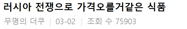온라인 커뮤니티에는 “러시아 전쟁으로 가격 오를 거 같은 식품”이라는 제목의 글이 올라와 누리꾼들 사이에서 엄청나게 화제가 되고 있다.