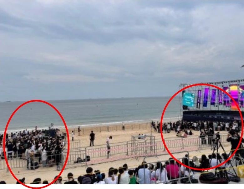 사진을 보면 아이돌 공연을 눈앞에서 감상할 수 있는 무대 앞은 외국인들에게만 허용됐고, 내국인들은 그 뒤에서 관람할 수 있었다.