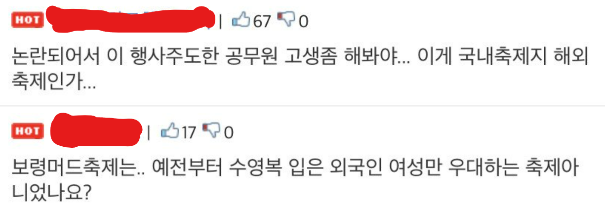 사연을 접한 누리꾼들은 “행사 주도한 공무원들 문책해야 한다”, “이게 국내 축제지 해외 축제냐?”, “예전부터 수영복 입은 외국인 여성만 우대하는 축제”, “나중에 금발 염색하고 비키니 입고 간다” 등 반응을 보였다.