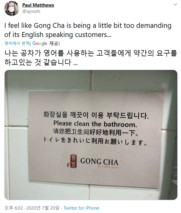 “I feel like Gong cha is being a little bit too demanding of its English speaking customers…”라며 글을 남겼다.