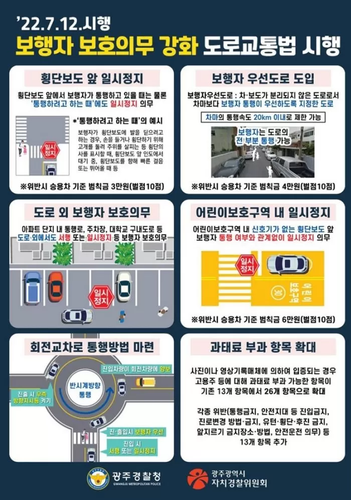 지난 11일 광주경찰청과 광주시 자치경찰위원회에 따르면, 12일부터 시행되는 개정 도로교통법은 횡단보도·어린이보호구역 등지에서의 보행자 보호 의무 강화가 핵심이다.