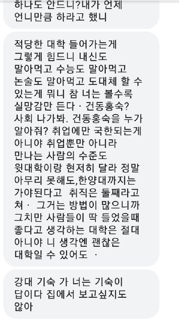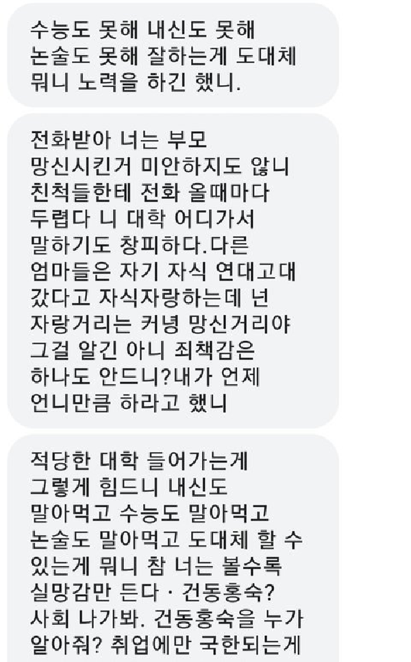 노력을 하긴 했냐”, “부모 망신시킨 게 미안하지도 않냐. 친척들한테 전화 올 때마다 두렵다”, “다른 엄마들은 연고대 갔다고 자랑하는데 넌 그냥 망신거리다” 등 비난을 쏟아냈다.