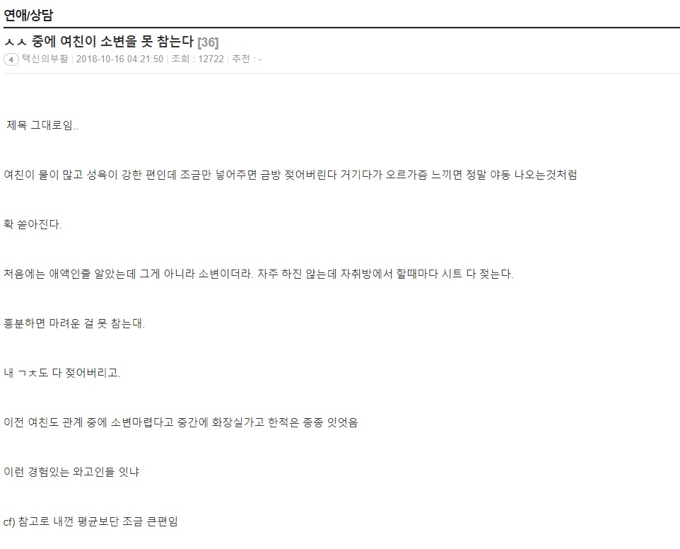 게시글을 올린 작성자 A씨는 “ㅅㅅ할때 여친이 소변을 못 참는다”라는 제목의 글로 많은 이들의 관심을 끌었다.