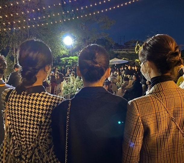 이들은 야외 결혼식장에 하객으로 참석한 모습이었으며, 단정히 묶은 헤어스타일로 눈길을 끌었다.