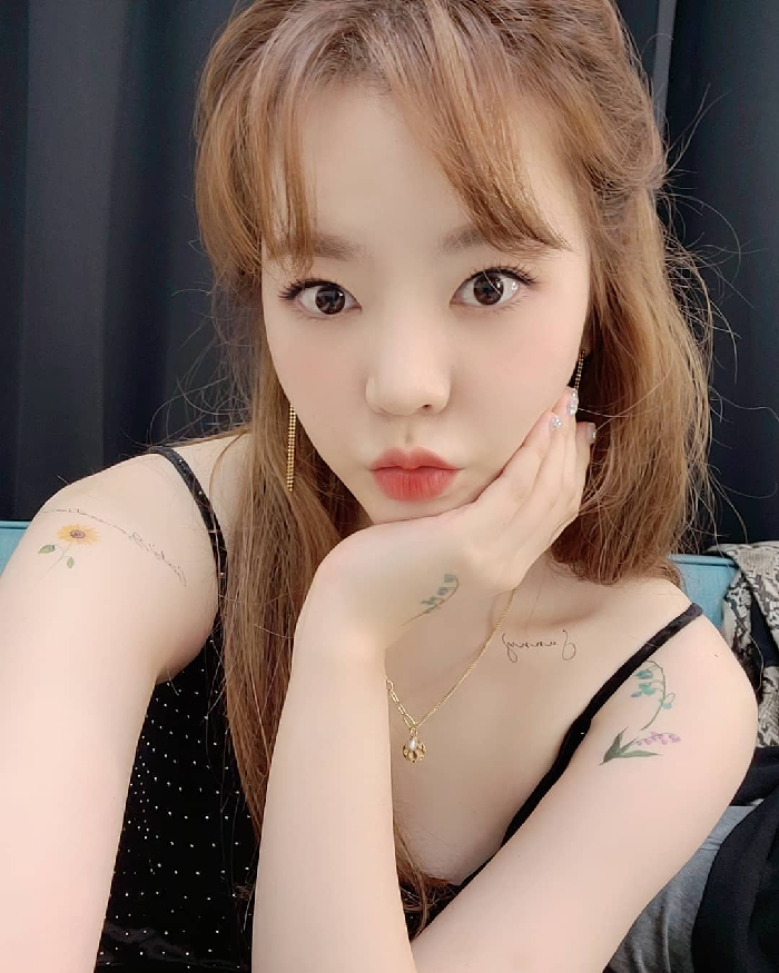 써니의 쇄골 부근과 어깨, 손에는 다양한 디자인의 타투가 그려져 있다. 레터링부터 해바라기까지 과감한 타투로 색다른 모습을 선보였다.