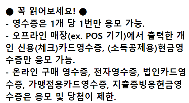 현금으로 구입한 때에는 정말로 큰 돈(최소 10만원 대 이상)이 아닌 이상 영수증이 발급되지 않지만, 카드로 구입한 때에는 돈을 아무리 적게 썼든 크게 썼든 꼭 나온다.