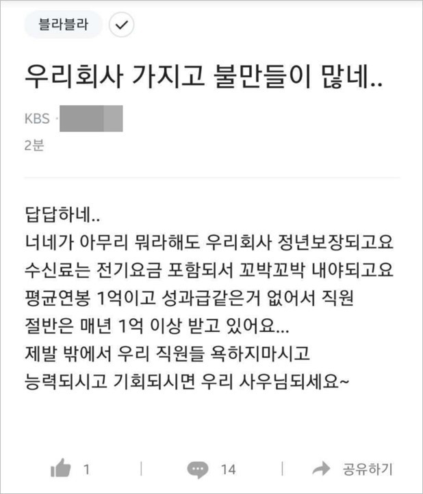 직장인 커뮤니티에 KBS 직원으로 추정되는 이용자가 ‘KBS에 불만 갖지 말고 능력 되면 입사하라’는 취지의 글을 올려 네티즌들의 공분을 사고 있다.