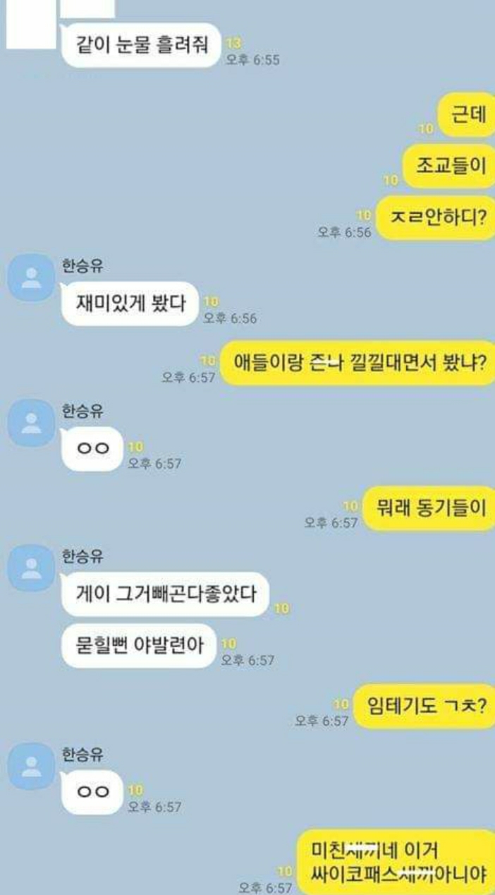 이를 접한 누리꾼들은 “ㅋㅋㅋㅋㅋㅋ 진짜 승유좌도 윾쾌하넼ㅋㅋㅋㅋㅋㅋㅋ” “임테기 진짜 선넘었다 생각했는데 ㄹㅇㅋㅋㅋㅋㅋ 유쾌하게 받아들이네” “아 진짜 저런 친구들 있어야 꿀잼임” 등의 반응을 보였다.