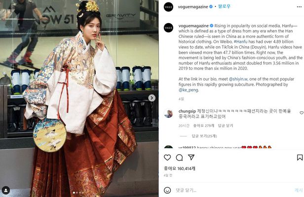 보그는 공식 인스타그램 계정에 한복을 떠올리게 하는 옷을 입은 중국인 유튜버 시인의 사진과 함께 해당 의상을 ‘한푸’라고 소개했다.