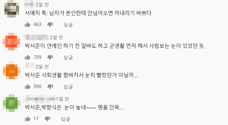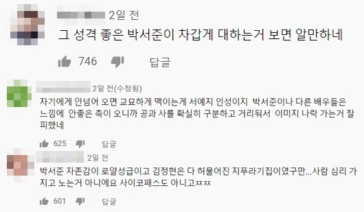 서예지 인터뷰를 접한 네티즌들은 “그 성격 좋은 박서준이 차갑게 대하는 거 보면 알만 하다”, “박서준이 연예인하기 전에 알바도 하고 군생활 먼저 해서 사람 보는 눈이 있었던 듯”, “안 친해진 건 박서준이 똑똑한 거지”, “박서준 철벽방어 내공 세다”, “박서준 명품 안목”이라는 댓글을 남기기도 했다고 한다.