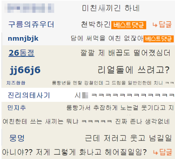 이렇게 글을 마쳤고 해당 커뮤니티 회원들의 반응은 그저 웃기다며 댓글을 달거나 작성자를 비난하곤 했다.
