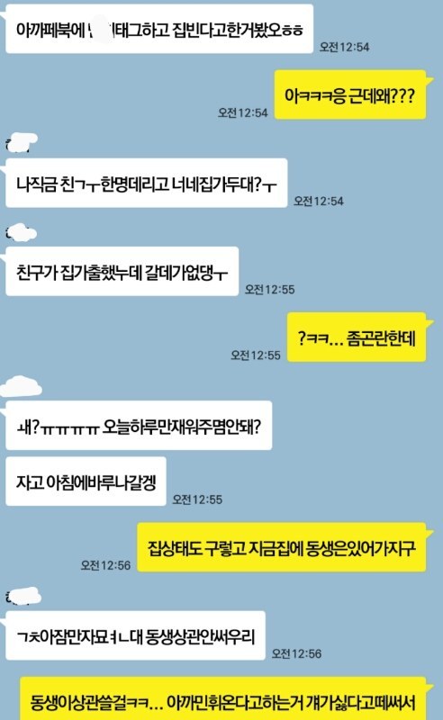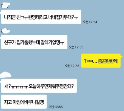 우리반 일진한테 카톡이 왔어내가 페북에 오늘 엄빠 여행가셔서 집 빈다고 글썼는데