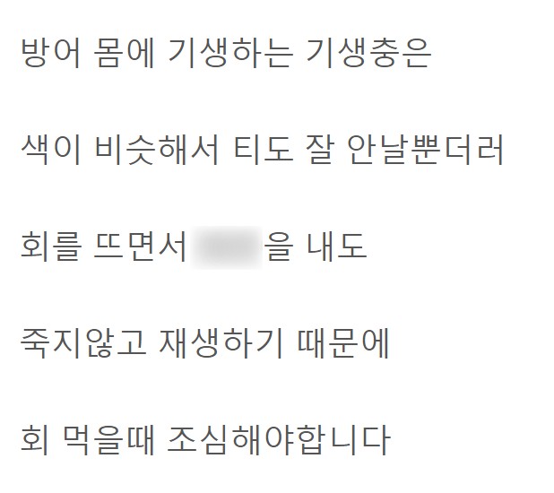 대방어 회의 기생충은 색깔도 같고 손질 과정에서 몸통 부분이 짤리더라도 다시 살아난다는 것이다.