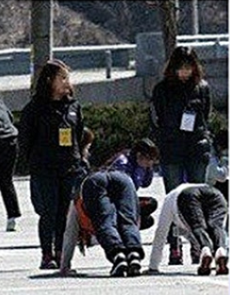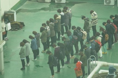 3학년 앞에 2학년이 두 손을 공손히 모으고,