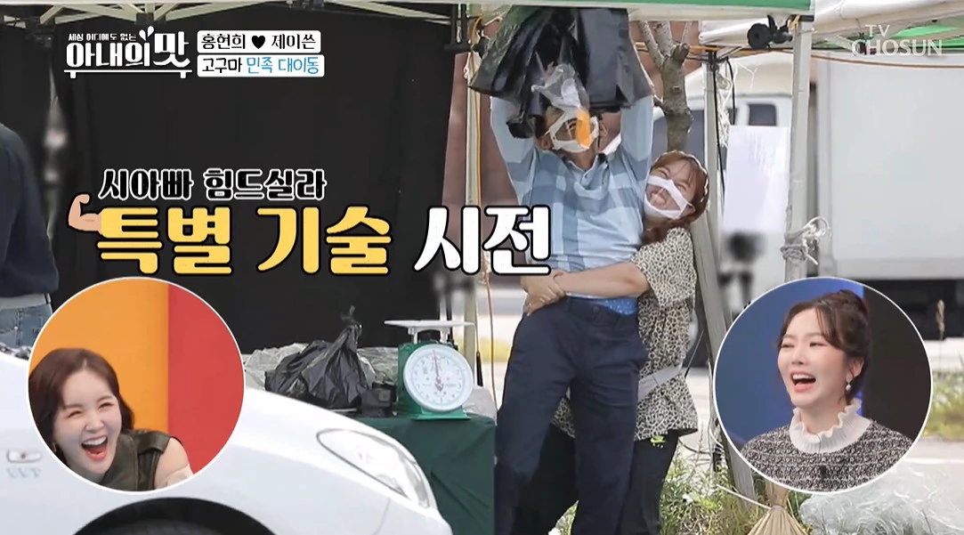 그래도 손이 닿지 않자 홍현희는 시아버지를 붙잡고 번쩍 들어올렸다.