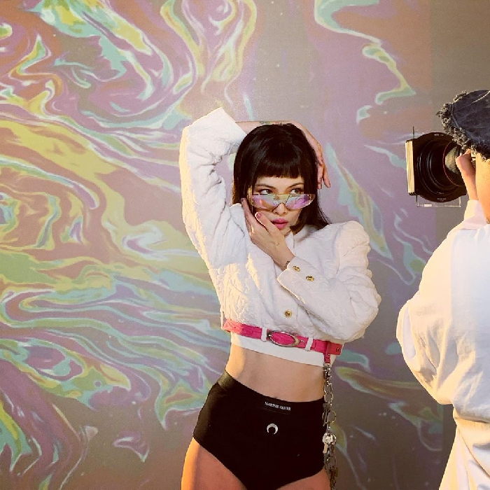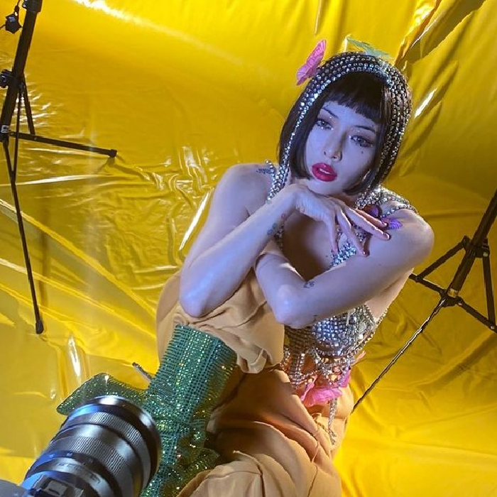 공개된 사진 속 현아는 촬영을 위해 독특한 의상을 입고 있다. 현아는 노란색 바지에 큐빅 크롭탑을 착용한 채 카메라를 응시하고 있다. 반짝이는 헤드피스가 그의 미모를 더욱 돋보이게 한다.