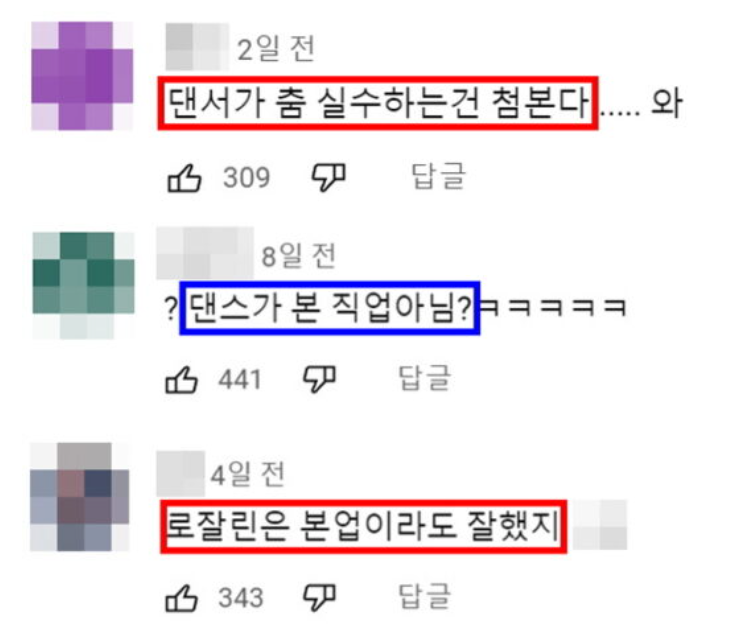 수많은 네티즌들은 이에 대해서 ”댄서가 춤 실수하는 거 처음 본다”, ”댄서가 본 직업 아님?”, ”(인성 논란으로 시끄리웠던 댄서) 로잘린은 본업이라도 잘했지”와 다양한 댓글 반응을 남겼다.