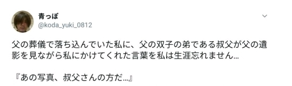 “父の葬儀で落ち込んでいた私に、父の双子の弟である叔父が父の遺 影を見ながら私にかけてくれた言葉を私は生涯忘れません…