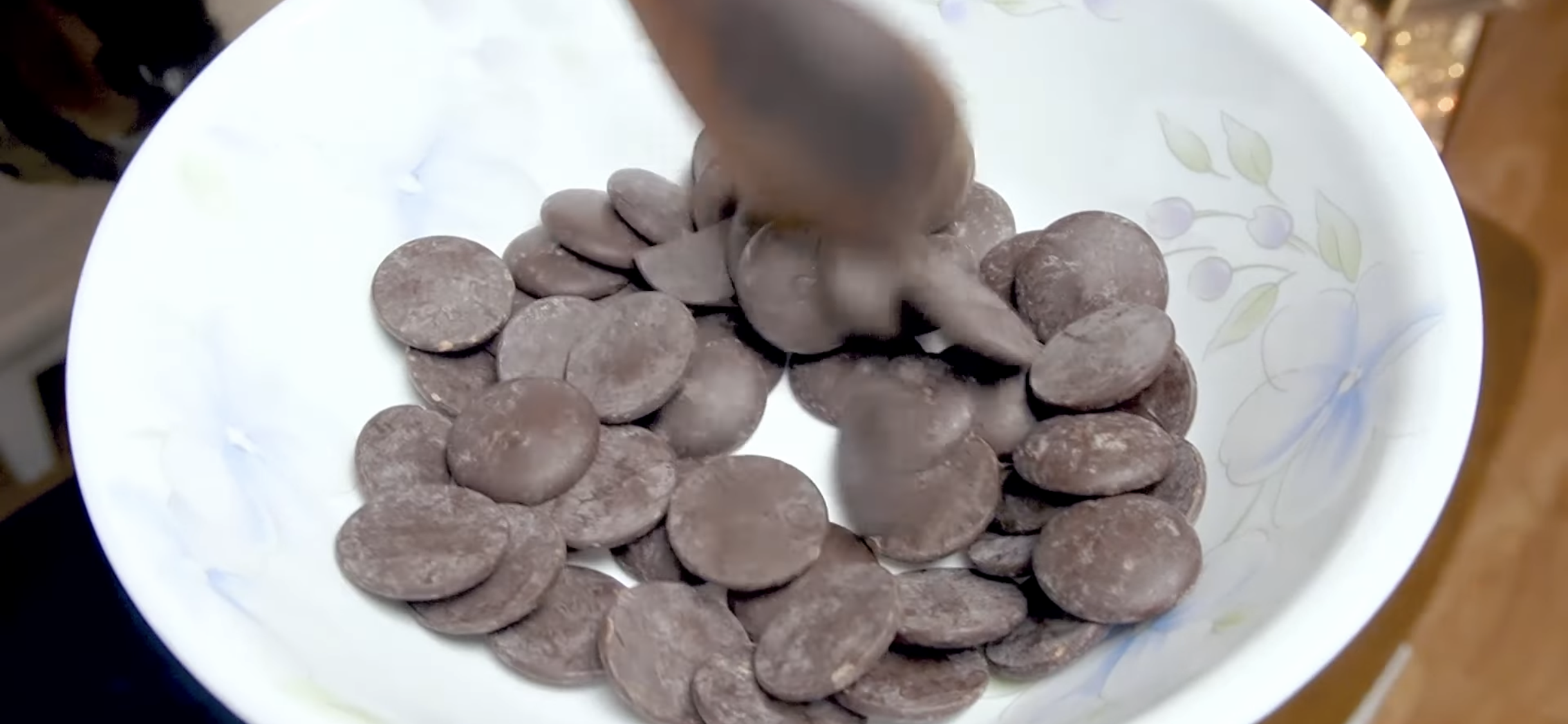 다크 초콜렛을 녹인 후 동그란 몰드에 두 번씩 덧발라 굳힌다.