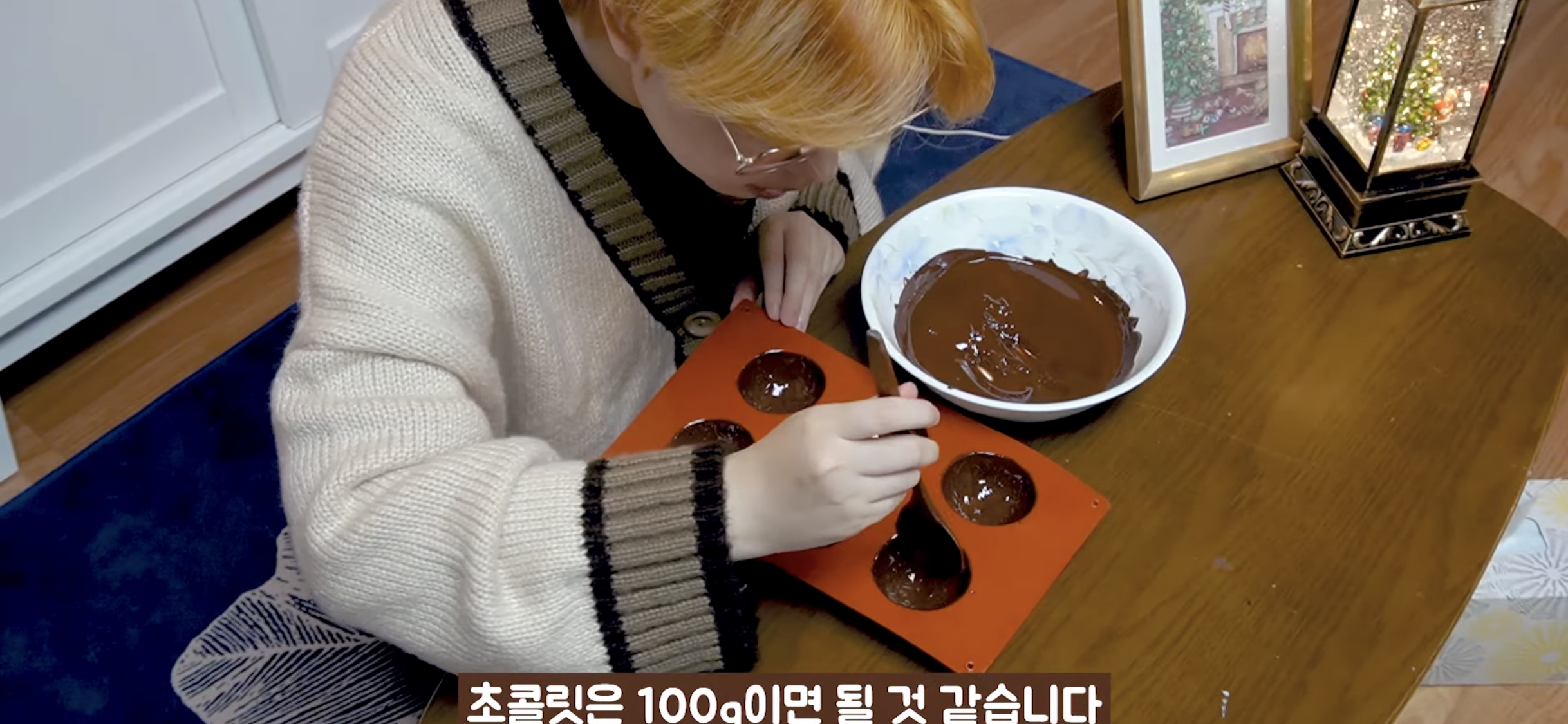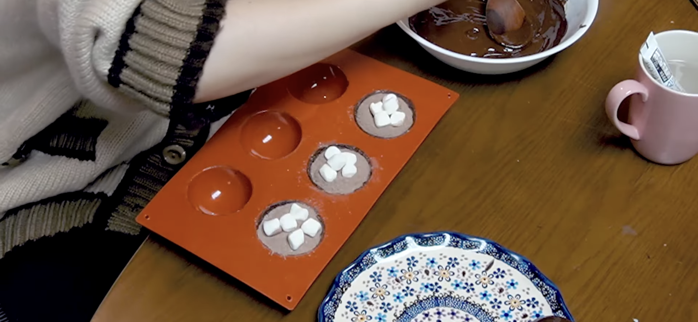 초콜렛 안에 코코아 가루와 마시멜로우 등을 넣고 나머지 틀을 덮어 원형을 완성한다.