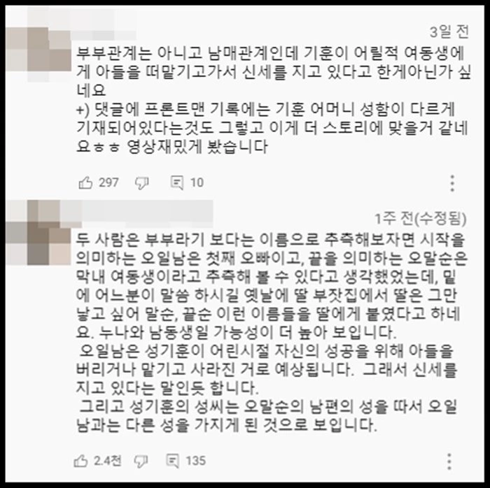 해당 뇌피셜 영상이 화제가 되고 있는 가운데 일부 네티즌은 ‘성기훈이 오일남의 친아들은 맞으나, 성기훈의 엄마(이하 김영옥 분)와 오일남은 부부가 아닌 남매 사이일 것’이라고 새로운 추측을 하고 있는데, 이는 ‘오징어 게임’ 1화에서 성기훈 엄마 이름이 ‘오말순’이라고 나왔기 때문이다.