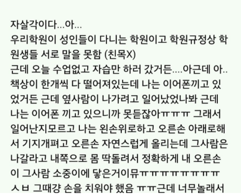 A씨는 성인들이 다니는 학원에서 열심히 공부를 하고 있었고 어느날 큰 사건이 일어났다.