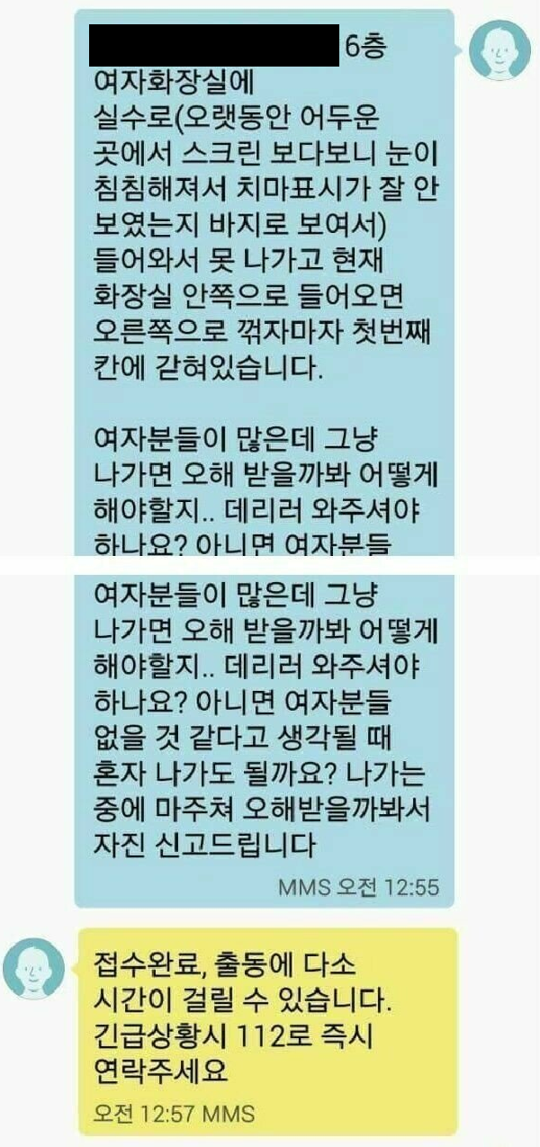 당황한 A씨는 결국 “여자 화장실에 갇혀있다. 나가면 오해 받을까 봐 어떻게 해야 할지 모르겠다. 나가는 중에 마주쳐 오해받을까봐 자진 신고한다”고 경찰에 신고했다.